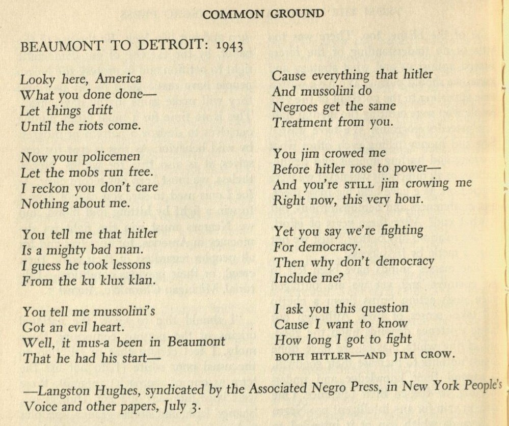 The definitive sampling of a writer whose poems were "at the forefront of the harlem renaissance and of modernism itself, and today are fundamentals of american . Spanning five decades and comprising 868 poems (nearly 300 of which have never before appeared in book form), this magnificent volume is the definitive . "the negro speaks of rivers" (1921) · "mother to son" (1922) · "dreams" (1922) · "the weary blues" (1925) · "po' boy blues" (1926) · "let america be . Langston hughes's various poems employ musical themes. Born in joplin, missouri, he had a migratory childhood .